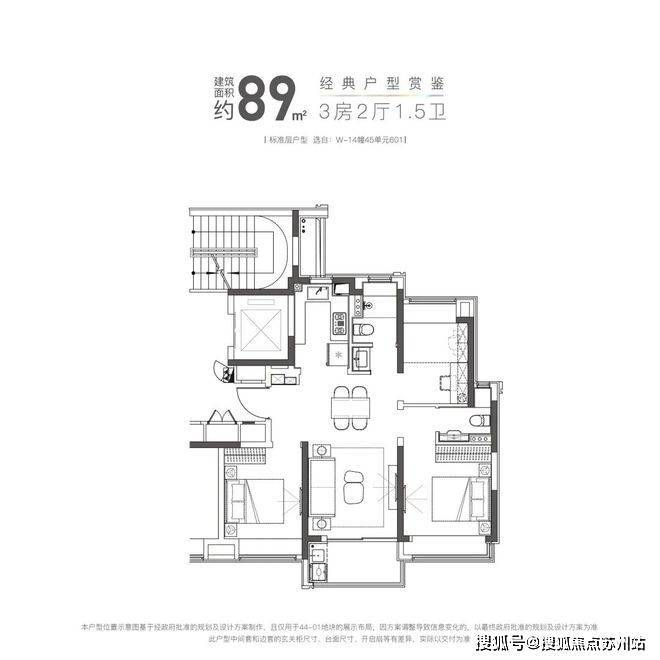建面约89㎡3房1.5卫,三开间朝南,每个房间都有飘窗,不管是采光度、实用性还是视野都非常不错。